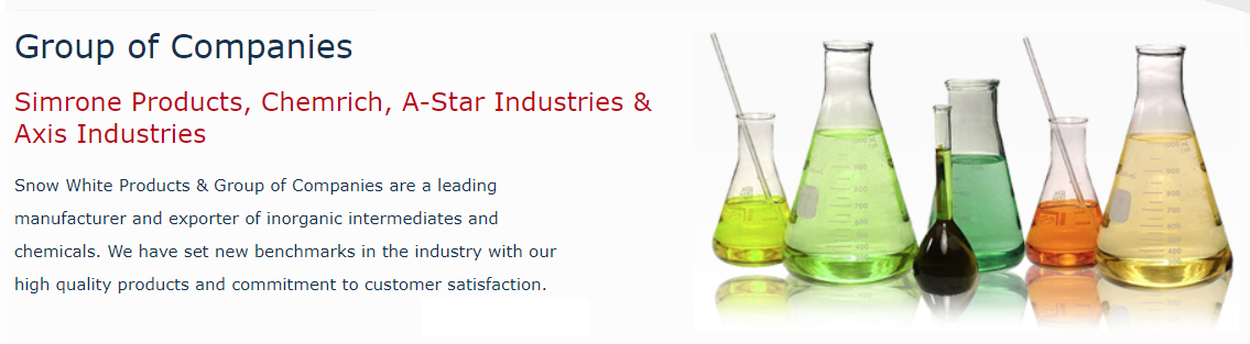 Snow White Products & Group of Companies are a leading manufacturer and exporter of inorganic intermediates and chemicals. We have set new benchmarks in the industry with our high quality products and commitment to customer satisfaction.