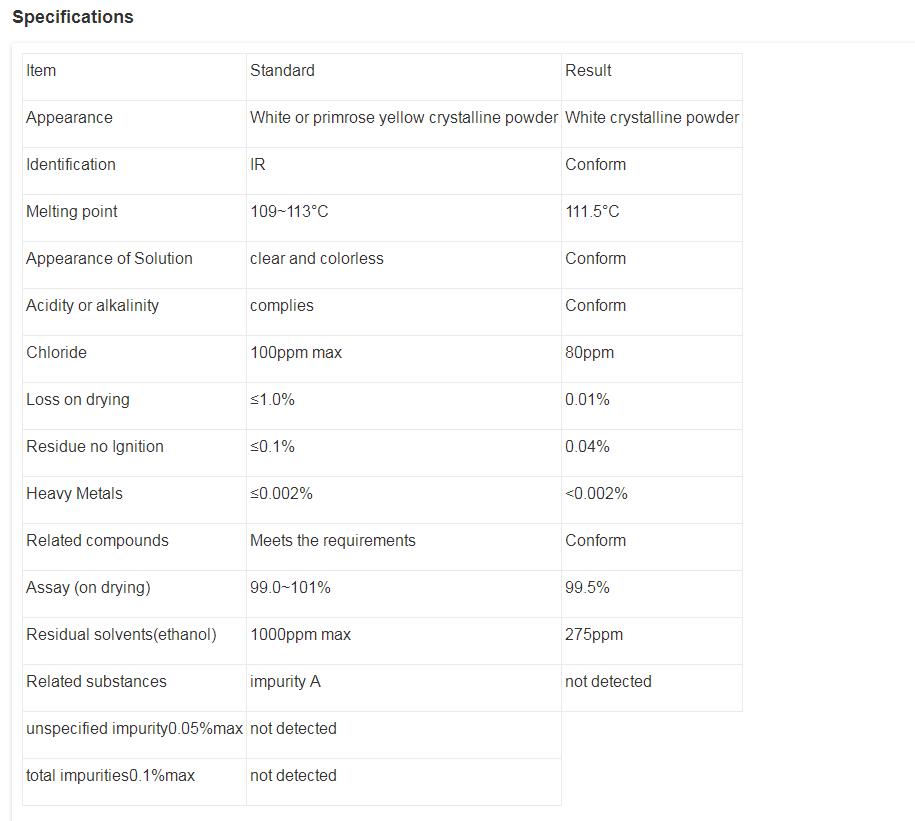 Colorless crystal or white crystalline powder.Soluble in benzene, ethanol, water, chloroform, soluble in ether.No stinky, bitter taste.