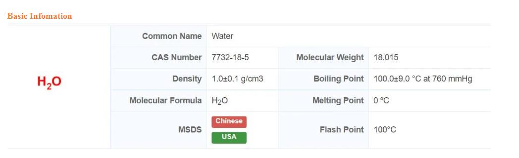 Water, whose chemical formula is H2O, is an inorganic substance composed of hydrogen and oxygen. It is non-toxic and drinkable. It is a colorless and odorless transparent liquid under normal temperature and pressure, and is known as the source of human life. Water is one of the most common substances on the earth. It is an important resource for the survival of all life including inorganic compounds and human beings. It is also the most important part of living organisms.