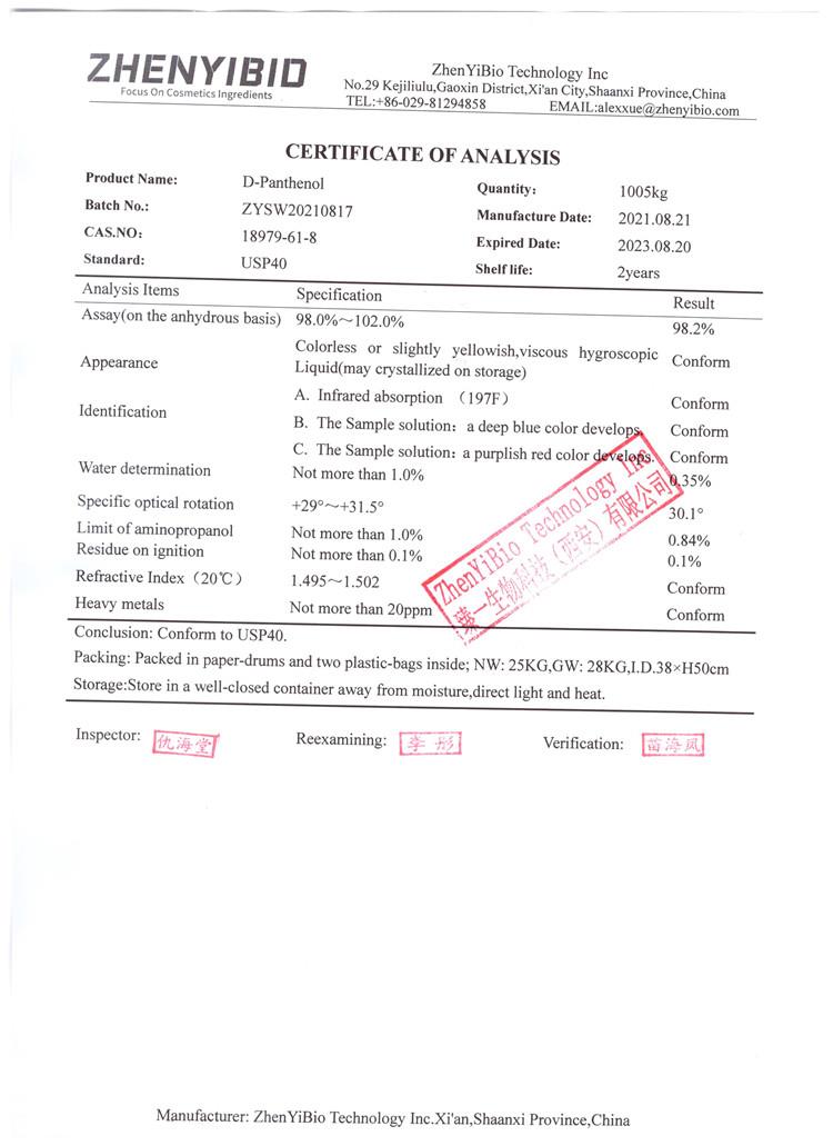Dexpanthenol is the precursor of vitamin B5, so it is also called provitamin B5. It contains not less than 98% D-panthenol.It is a colorless to light yellow transparent viscous liquid with a slight special smell.Dexpanthenol uses to treat sunburns,mild burns,mild skin injuries and diseases (concentrations up to 2% to 5%).Dexpanthenol for skin to improves hydration,reduces skin itching and inflammation,improves skin elasticity,and speeds up the healing of epidermal wounds.For this reason, it is sometimes combined with allantoin.Dexpanthenol for hair care, skin moisturizing, and help heal skin wounds,resist inflammation, and help sunscreen. It is widely used in medicine, food, cosmetics and liquid preparations as a precursor of vitamin B5.